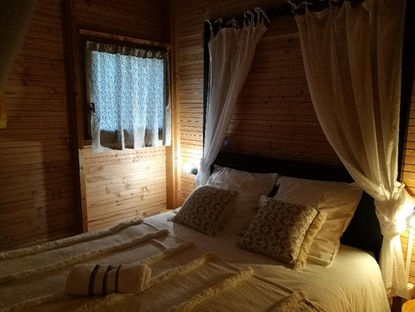 Jolie cabane en bois pour 2personnes, linge de lit et de salle de bain fournis, bouteille d’eau offerte, un coin café, micro onde et réfrigérateur privatif, sanitaires extérieurs, au coeur de la pinède, une terrasse privatisée sur laquelle vous sera servi le petit déjeuner chaque matin accompagné du chant des oiseaux ou des cigales en fonction de la saison.